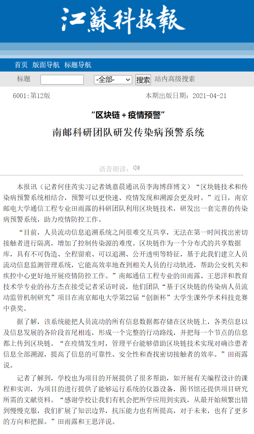 【江苏科技报】“区块链+疫情预警” 南邮科研团队研发传染病预警系统