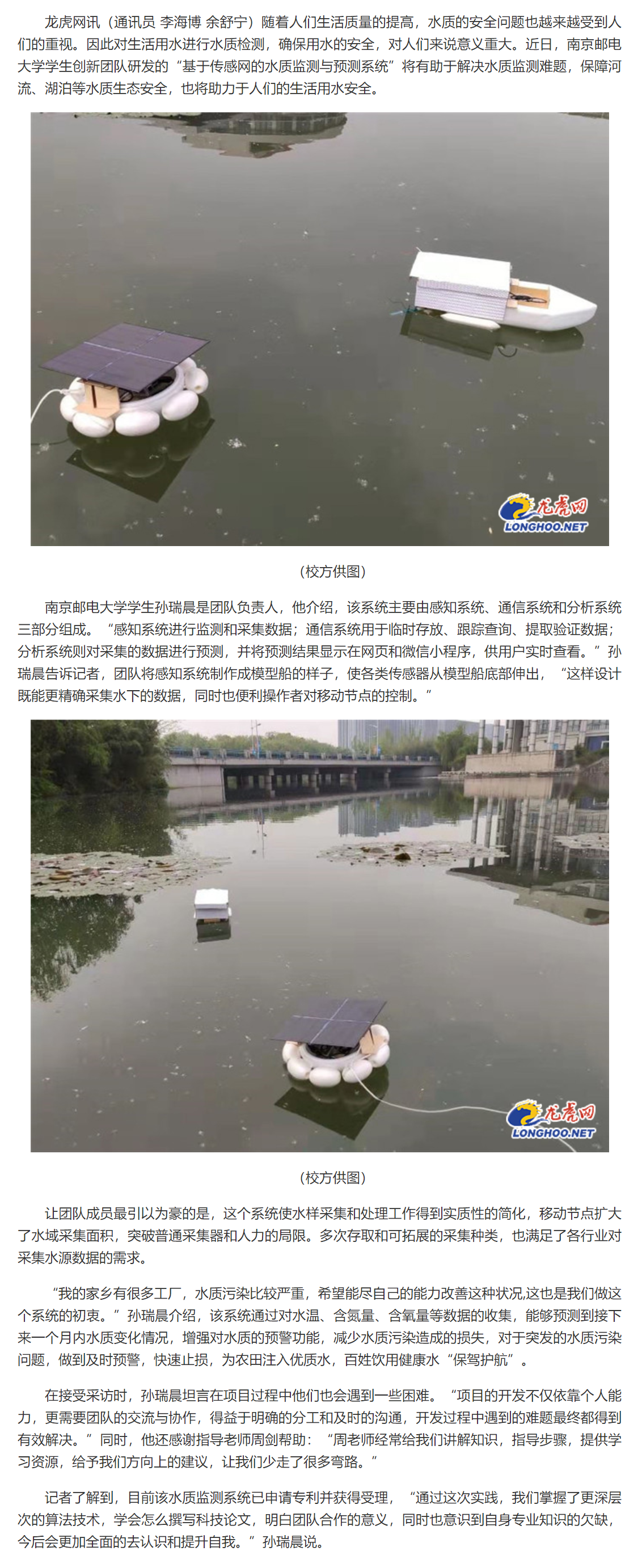 【龙虎网】小程序随时看 南邮团队研发水质监测系统为水安全“保驾护航”