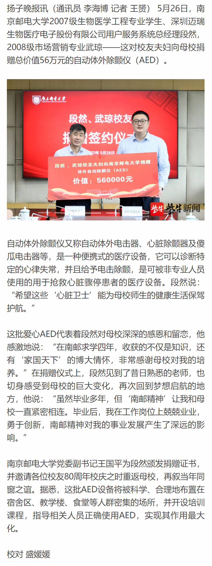 【扬子晚报客户端】AED进校园,南邮校友向母校捐赠“急救神器”