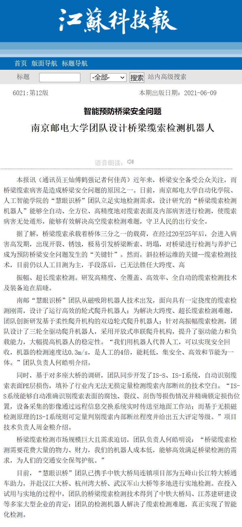 【江苏科技报】智能预防桥梁安全问题 南京邮电大学团队设计桥梁缆索检测机器人