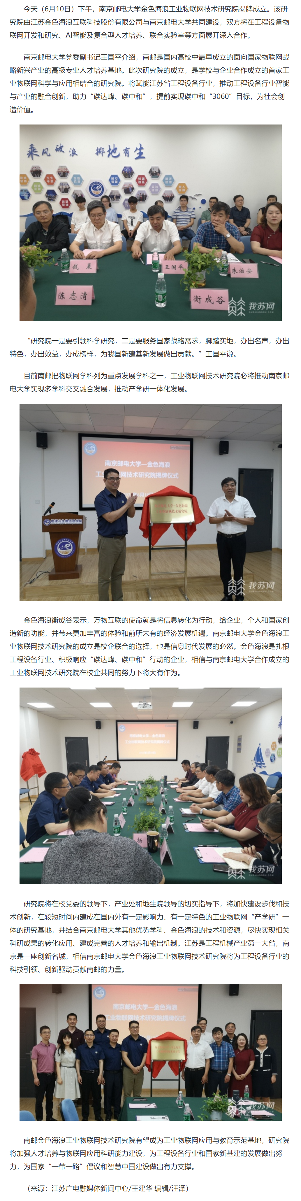 【我苏网】南邮与企业共建金色海浪工业物联网技术研究院