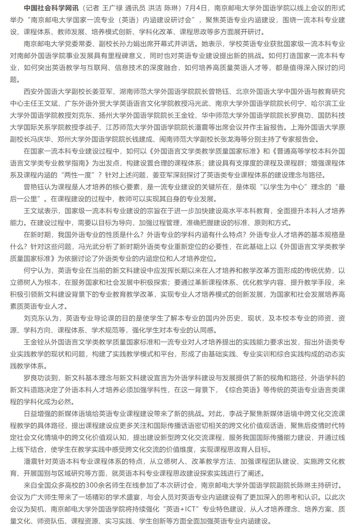 【中国社会科学网】加强英语专业内涵建设 “南京邮电大学国家一流专业(英语)内涵建设研讨会”举行
