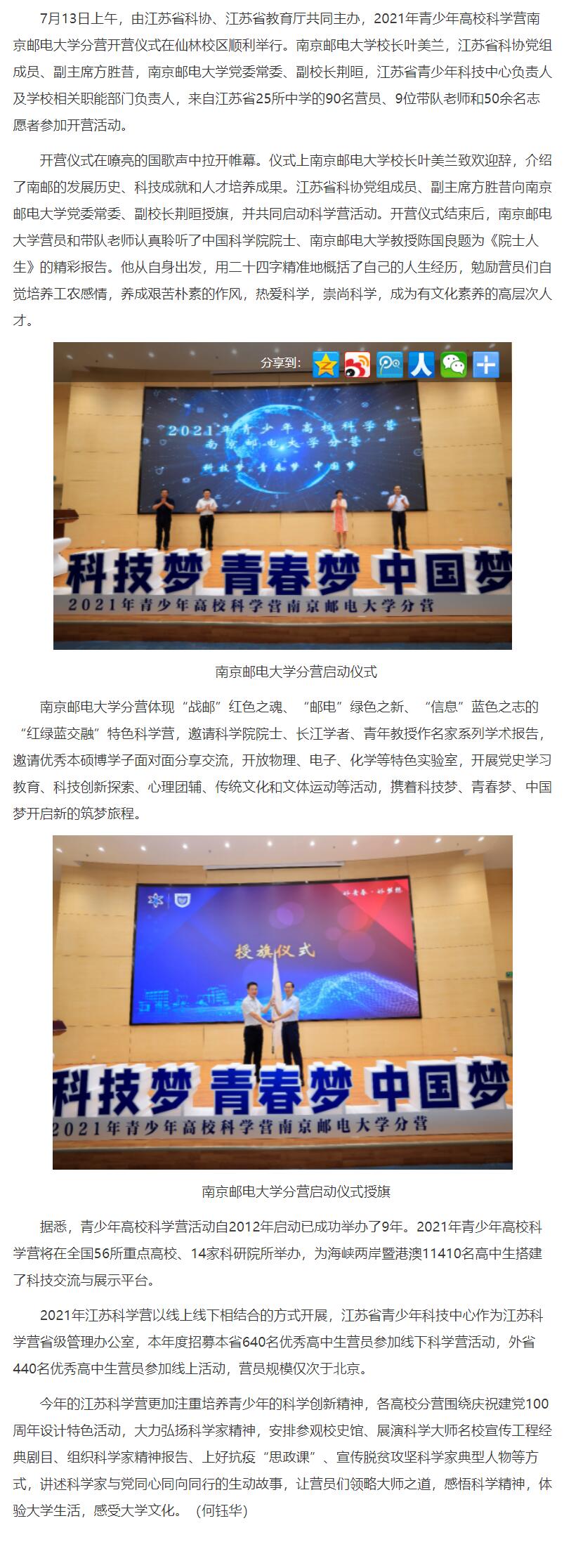 【新华网江苏频道】2021年青少年高校科学营南京邮电大学分营开营