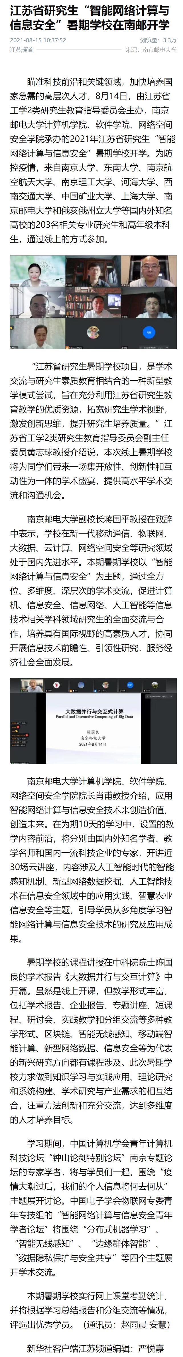 【新华社江苏频道】江苏省研究生“智能网络计算与信息安全”暑期学校在南邮开学