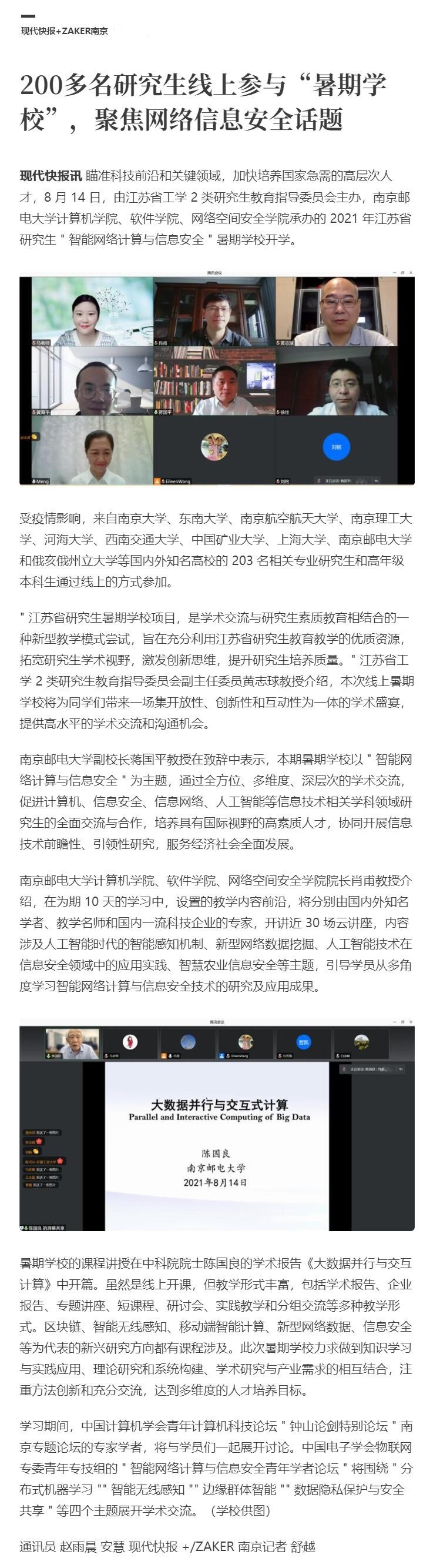 【现代快报全媒体】200多名研究生线上参与“暑期学校”,聚焦网络信息安全话题