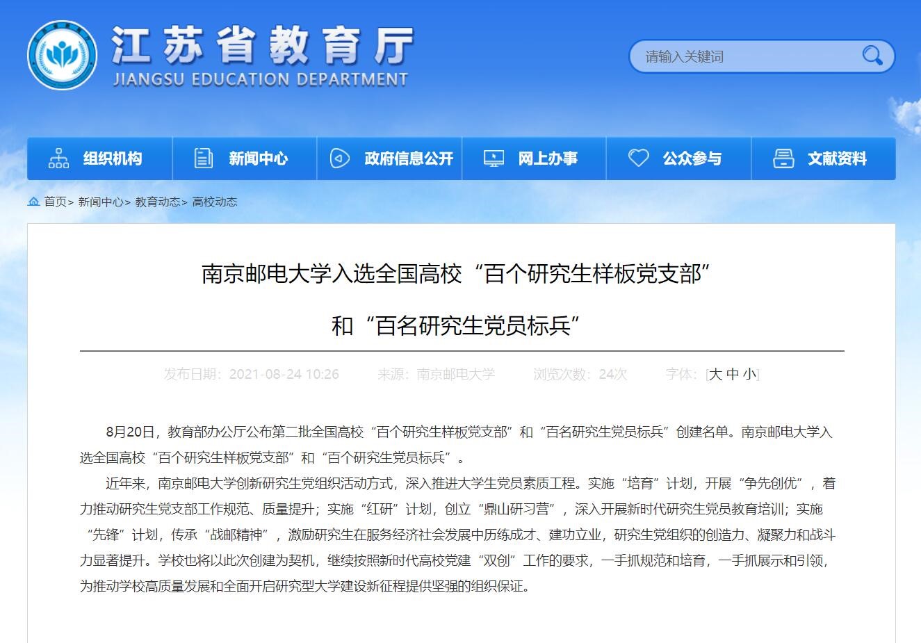 【省教育厅官网】南京邮电大学入选全国高校“百个研究生样板党支部” 和“百名研究生党员标兵”
