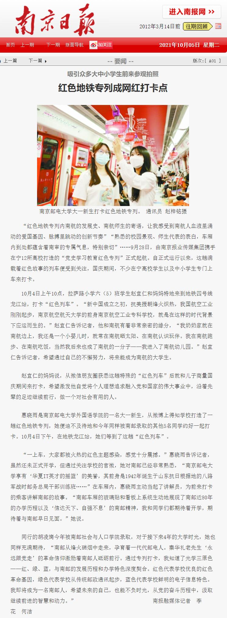 【南京日报】头版:红色地铁专列成网红打卡点