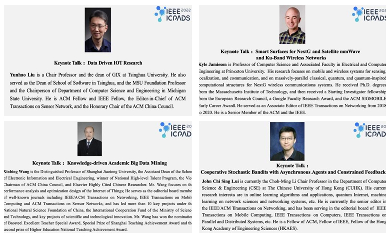 大会邀请清华大学刘云浩教授、美国普林斯顿大学Kyle Jamieson教授、上海交通大学王新兵教授和香港中文大学John C.S. Lui教授分别作《Data driven IOT research》《Smart Surfaces for NextG and Satellite mmWave and Ku-Band Wireless Networks》《Knowledge-driven Academic Big Data Mining》和《Cooperative Stochastic Bandits with Asynchronous Agents and Constrained Feedback》的主题报告。大会组织了9个专题论坛,分别是理论与协议、物联网和信息物理系统、无线感知和移动计算、大数据和机器学习系统、云计算和边缘计算、高性能计算和体系结构、系统和应用数据科学、安全和区块链、数据中心和无服务计算,共收到世界各国论文310篇,经专家审稿、大会组委会讨论,最终录取论文115篇(录用率37%),评选出1篇最佳论文《Maxwell’s Demon in Tail-tolerant, Resource-efficient Serverless Computing》以及3篇最佳论文提名奖。