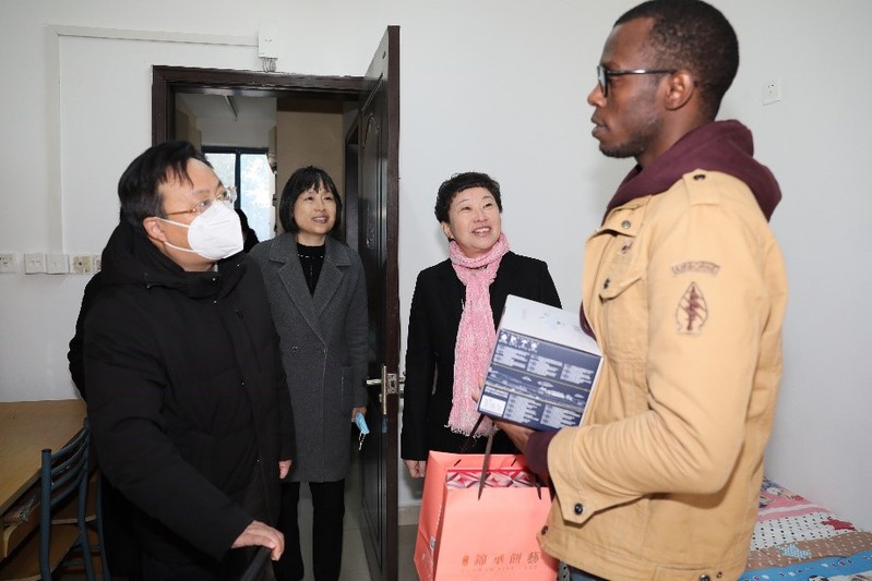 校领导为在校留学生发放慰问品