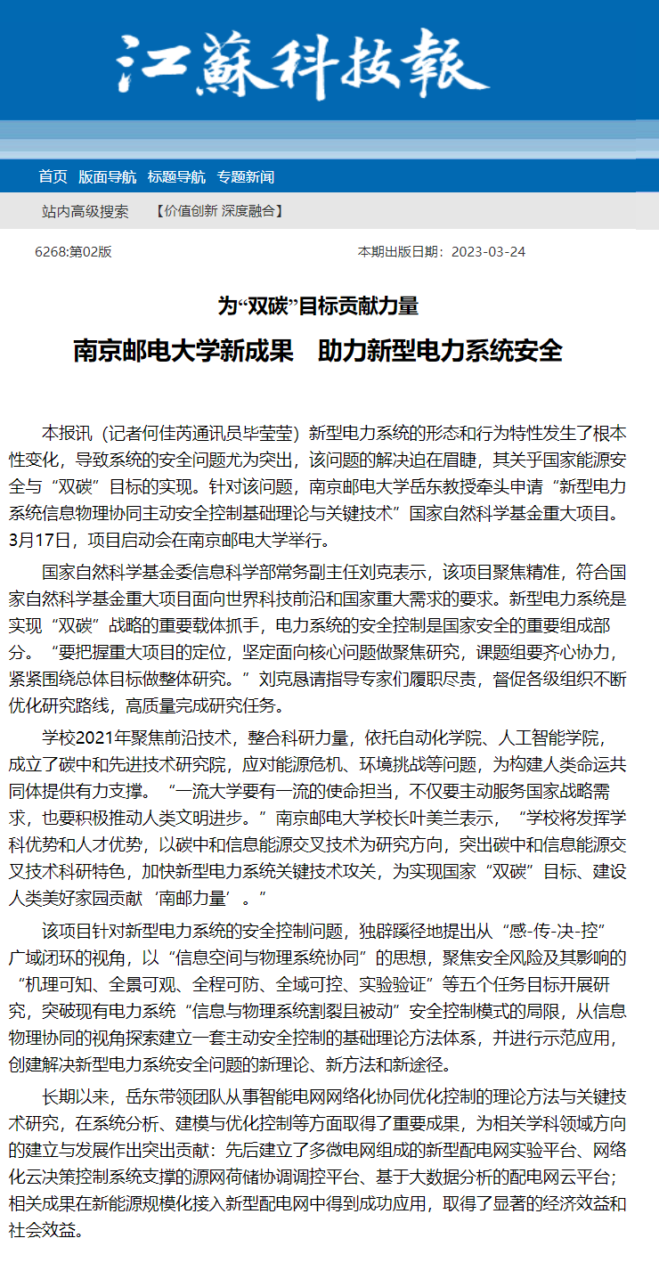 【江苏科技报】南京邮电大学新成果 助力新型电力系统安全