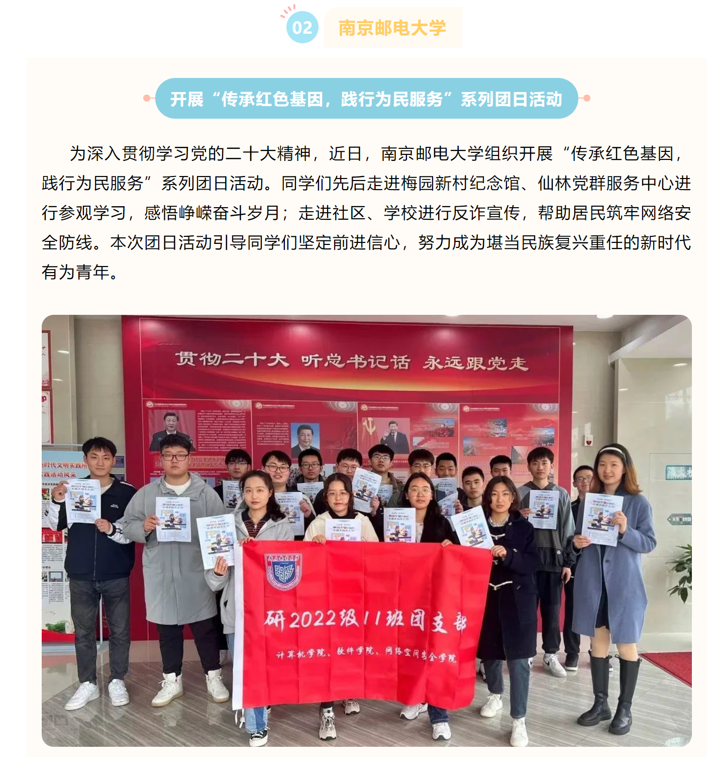 【省教育厅官微】南京邮电大学开展“传承红色基因,践行为民服务”系列团日活动