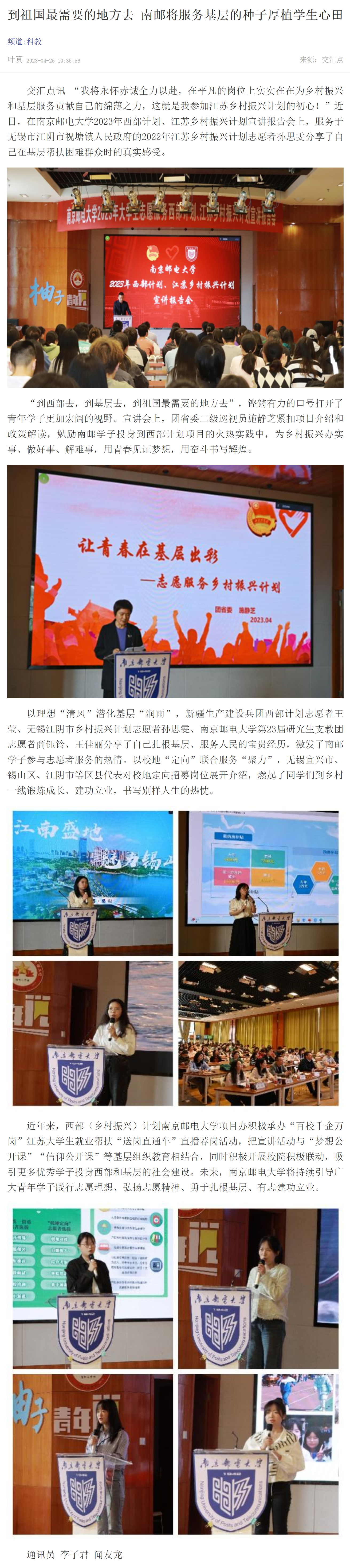 【新华日报客户端】到祖国最需要的地方去 南邮将服务基层的种子厚植学生心田