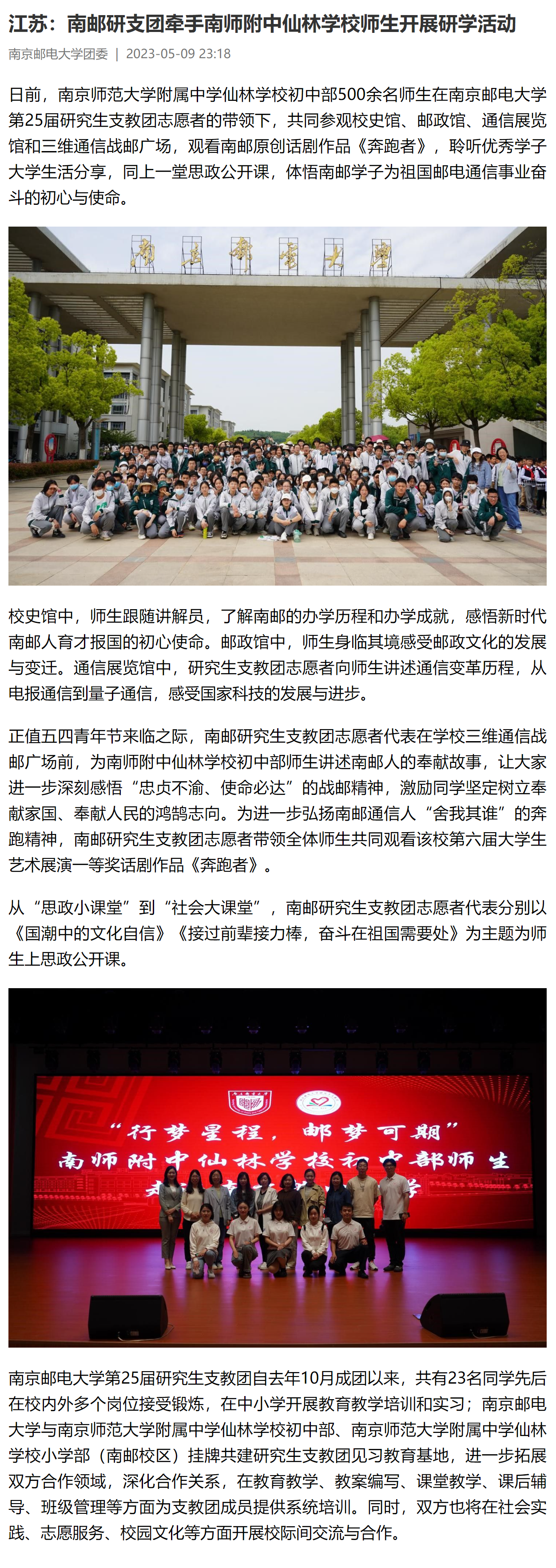 【中国青年报客户端】江苏:南邮研支团牵手南师附中仙林学校师生开展研学活动