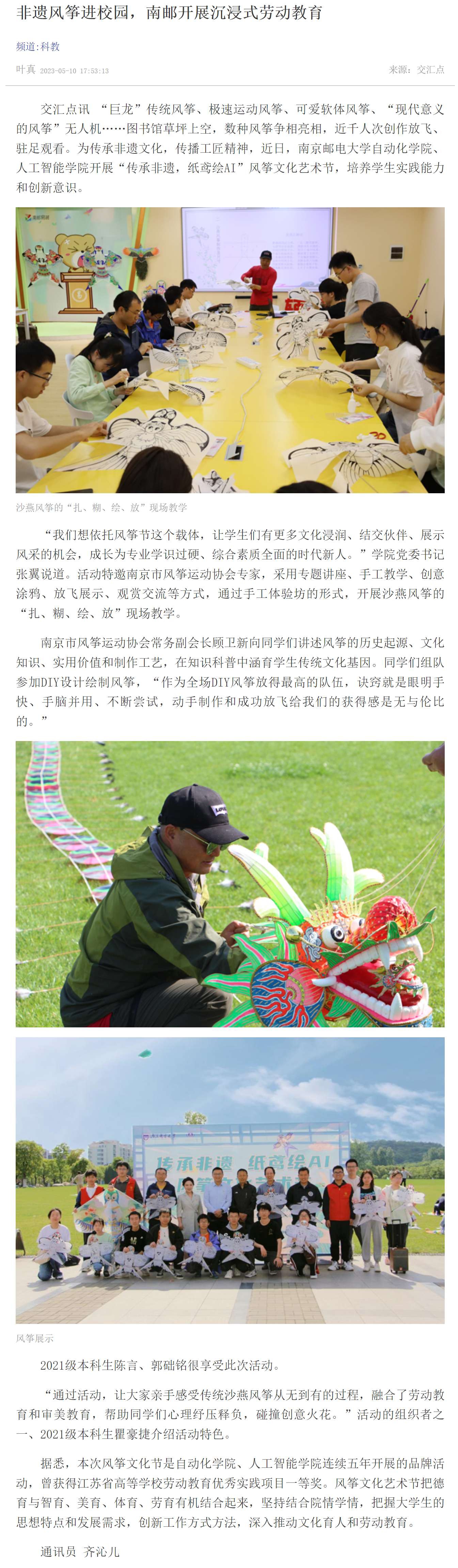 【新华日报客户端】非遗风筝进校园,南邮开展沉浸式劳动教育
