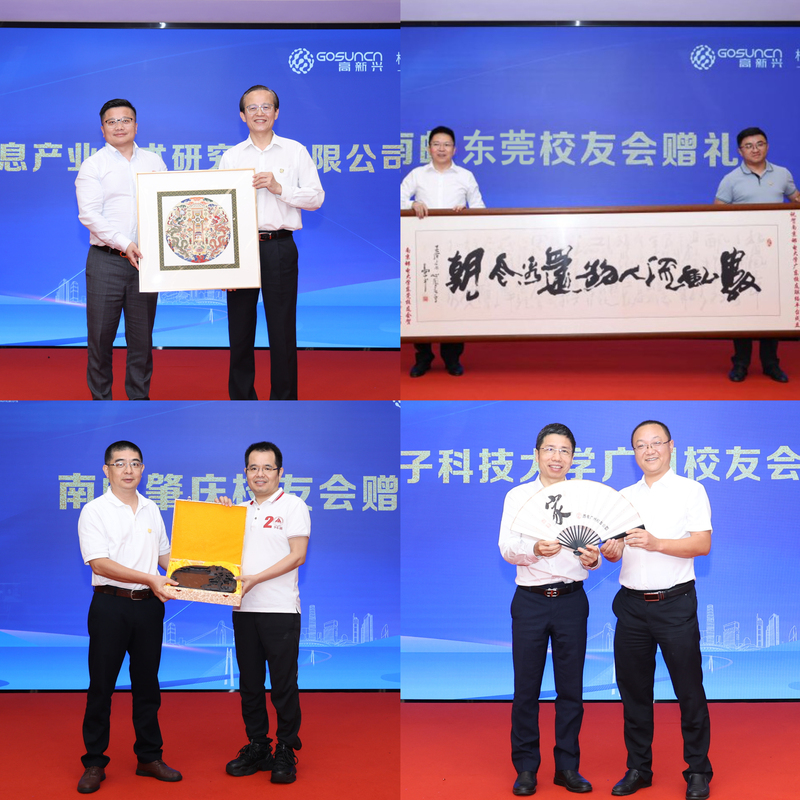 南京南邮信息产业技术研究院有限公司(左上)、南京邮电大学东莞校友联络平台(右上)、南京邮电大学肇庆校友联络平台(左下)、西安电子科技大学校友会(右下)赠贺礼