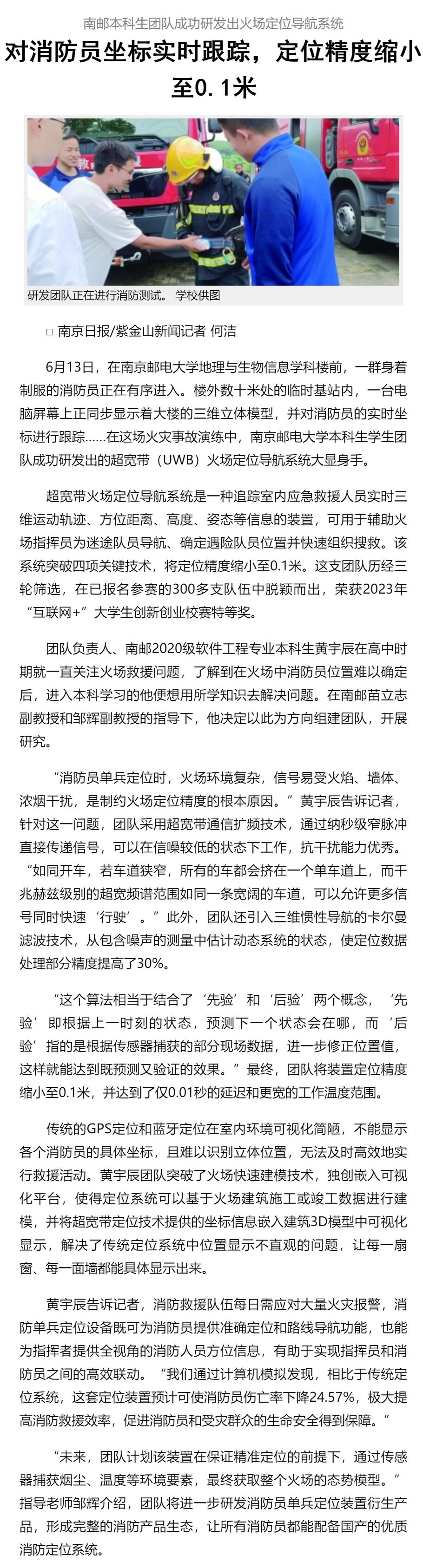 【南京日报】南邮本科生团队成功研发出火场定位导航系统 对消防员坐标实时跟踪,定位精度缩小至0.1米