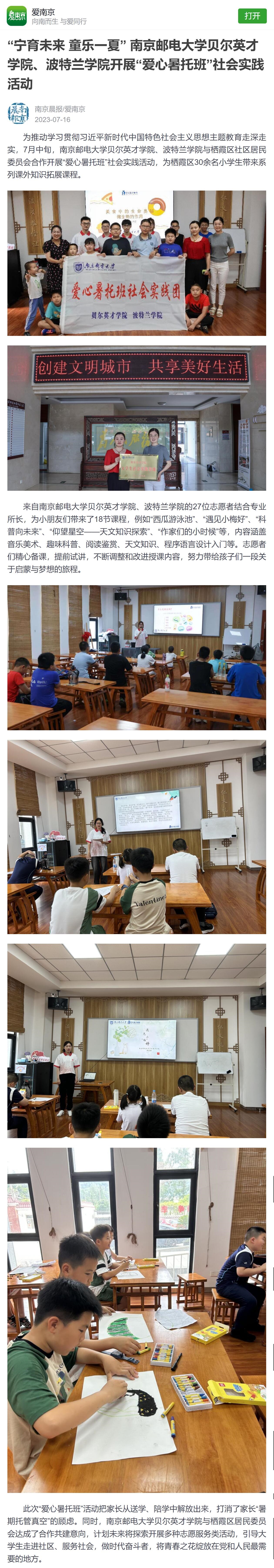 【南京晨报客户端】“宁育未来 童乐一夏” 南京邮电大学贝尔英才学院、波特兰学院开展“爱心暑托班”社会实践活动