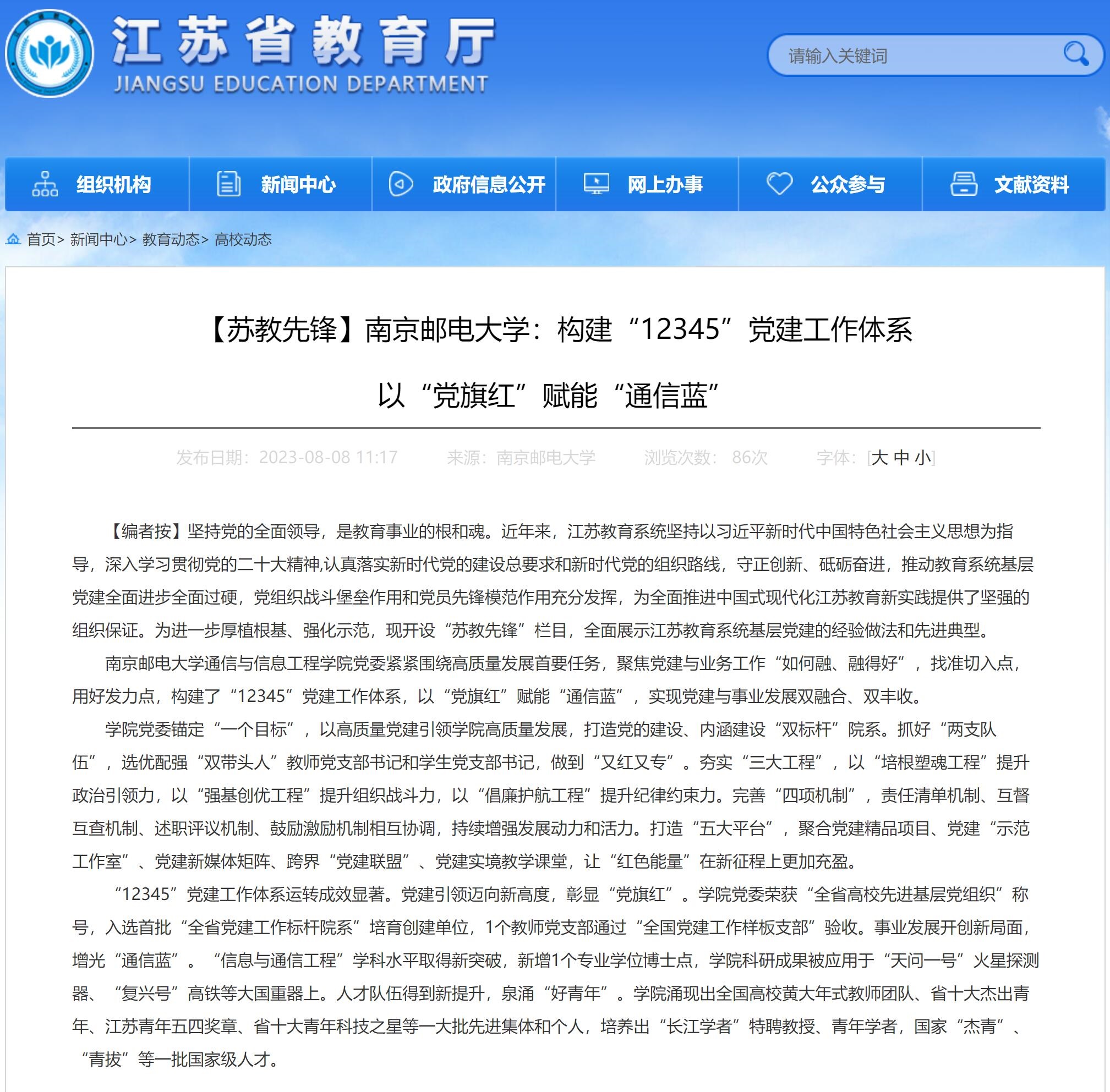 【省教育厅官网】南京邮电大学:构建“12345”党建工作体系 以“党旗红”赋能“通信蓝”