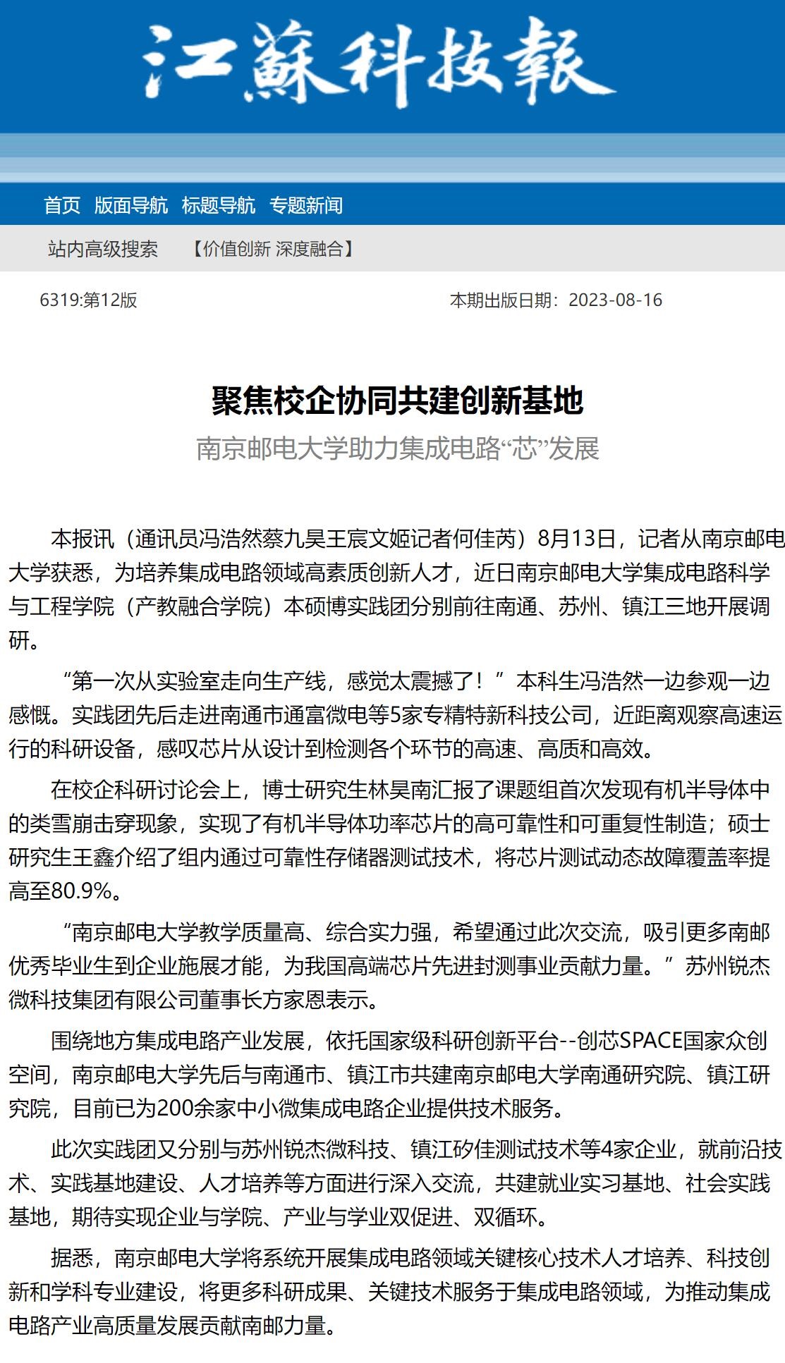 【江苏科技报】聚焦校企协同共建创新基地 南京邮电大学助力集成电路“芯”发展