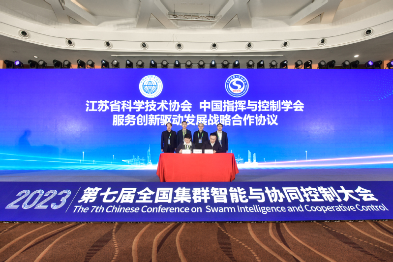 在中国指挥与控制学会名誉理事长戴浩院士、学会副秘书长宋鹏、董希旺等见证下,江苏省科学技术协会副主席李千目和学会副秘书长宋荣分别代表双方签署了《服务创新驱动发展战略合作协议》战略合作协议。