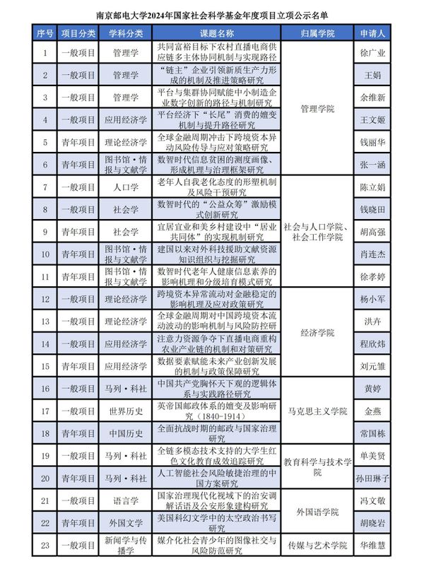 9月14日,全国哲学社会科学工作办公室公示了2024年度国家社会科学基金年度项目立项名单,南京邮电大学共获23项立项,立项总数位列全国第62位、江苏省第4位,立项率超过37%,是继2023年度获批17项后,再次突破历史记录,又创历史新高。此外,我校2024年度教育部人文社会科学研究项目共立项19项,位列全国第21位、江苏省第4位,是继2023年度获批16项后,再创历史新高;本年度我校江苏省社科基金获批数也再创佳绩,公示立项13项,位列全省第6位。