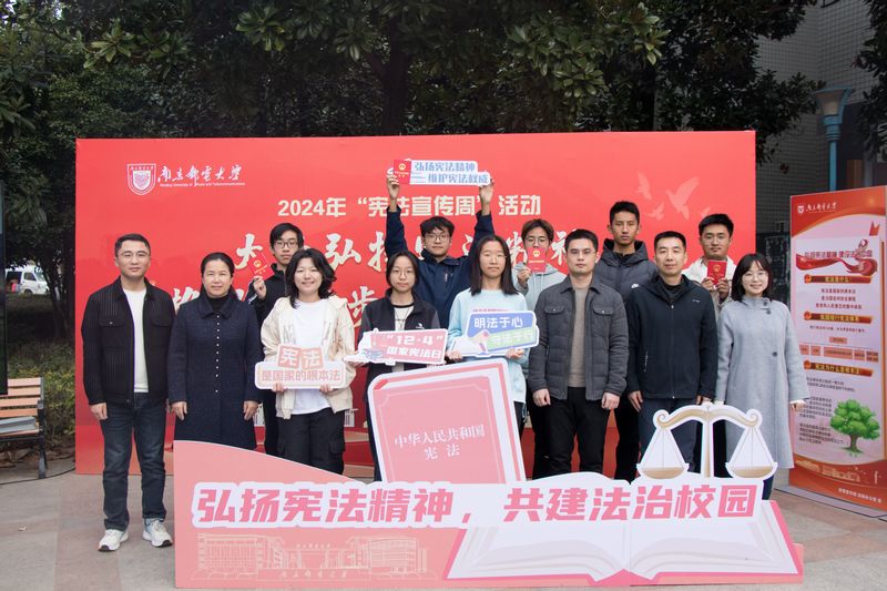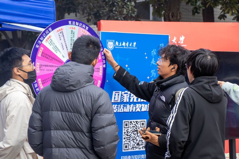 12月3日,由校党委宣传部、法制办公室联合主办,电子与光学工程学院、柔性电子(未来技术)学院承办的“国家宪法日”主题活动在仙林校区南二食堂外场举行。活动现场,工作人员通过播放宪法宣传视频,展示与讲解宪法宣传展板,发放宪法宣传手册和普法书籍,提供公益法律咨询服务,开展“12.4宪法知识竞答”“宪法大转盘”游戏、“我与宪法合照”等方式,向过往师生普及宪法知识,为我校师生带来一场互动式、零距离的普法新体验。