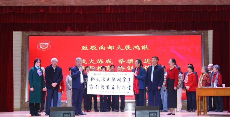 传红色血脉,承师者担当,助学子成才,播未来希望。近年来,广大老同志在助力青年师生成长方面发挥“银领”力量。为了表达我校1300多位老同志爱校荣校的心声,金川书画院负责人在活动现场挥毫泼墨,撰写了“战火炼生 举旗奋进 鼎新教育 再创辉煌”的书法作品献给学校,祝愿学校发展越来越好。郭宇锋书记代表学校接受了老同志们的美好祝福。