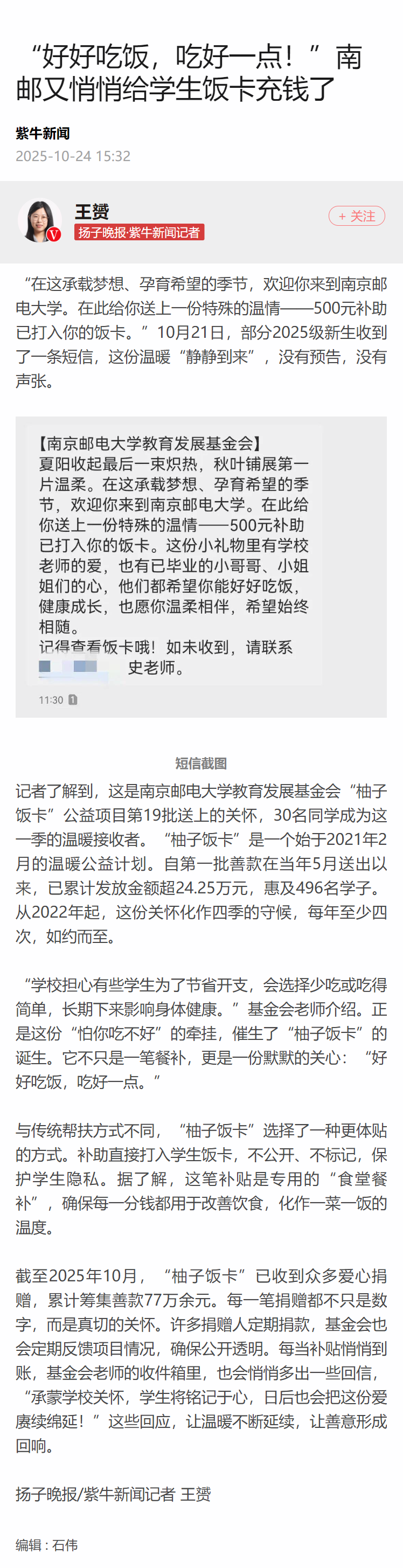 【扬子晚报客户端】“好好吃饭,吃好一点!”南邮又悄悄给学生饭卡充钱了