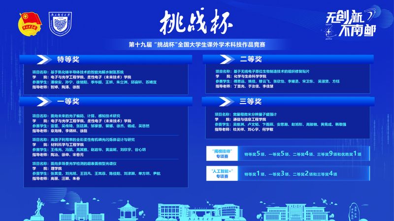 11月3日,第十九届“挑战杯”全国大学生课外学术科技作品竞赛终审决赛在南京闭幕,南京邮电大学获主体赛获特等奖1项、一等奖3项、二等奖1项和三等奖1项;“揭榜挂帅”专项赛特等奖5项、一等奖5项、二等奖4项、三等奖9项和优胜奖1项;“人工智能+”专项赛特等奖1项、一等奖3项、二等奖2项和三等奖4项。南邮首次实现特等奖赛道全覆盖,竞赛总积分达到历史最好成绩,全国并列第十五、江苏并列第二、省属高校第一,再捧国赛“优胜杯”。