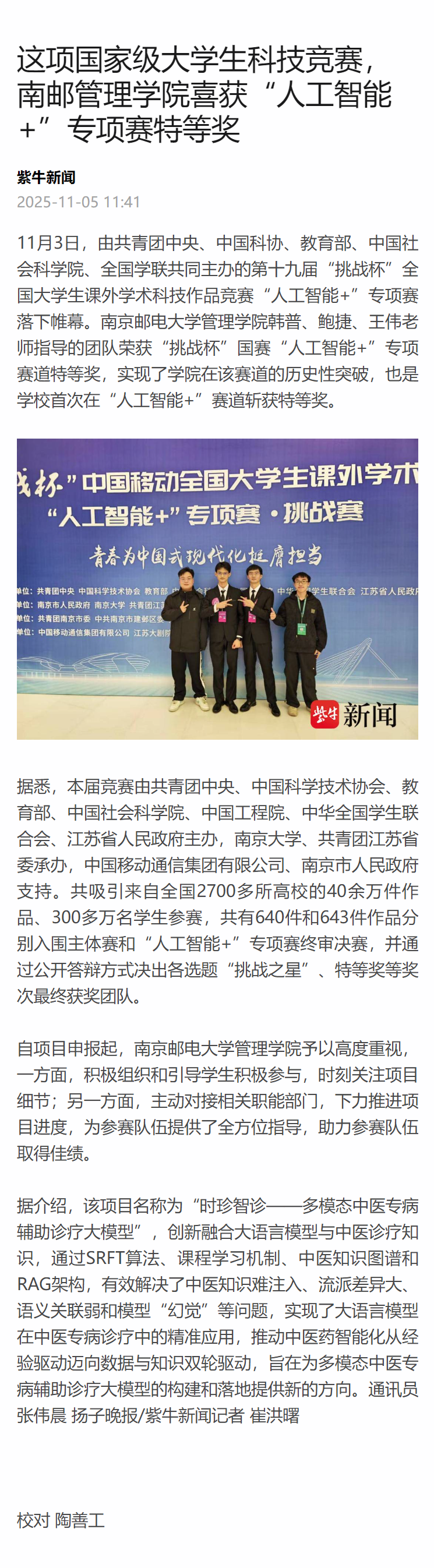 【扬子晚报客户端】这项国家级大学生科技竞赛,南邮管理学院喜获“人工智能+”专项赛特等奖