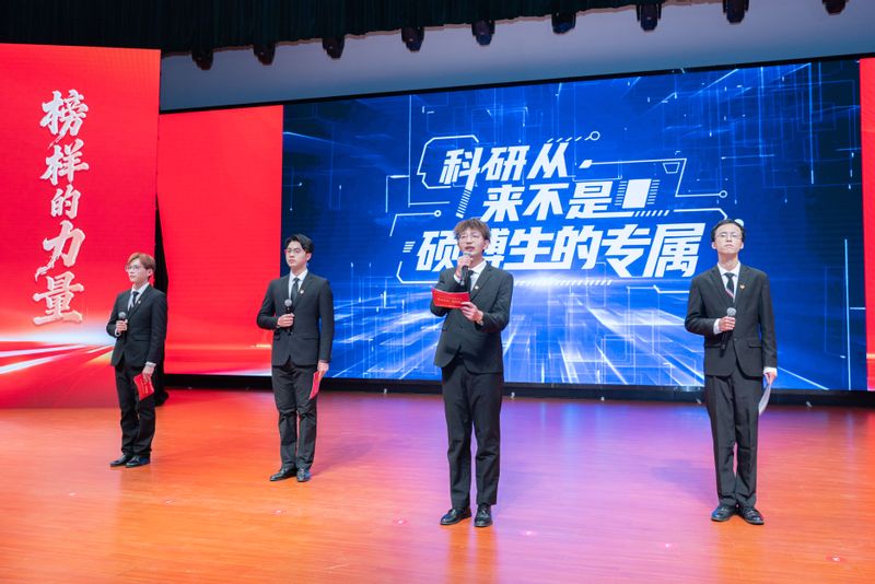 在“榜样的力量”篇章中,谢平为国家奖学金、省级、校级优秀学生等荣誉称号的集体和个人代表颁奖。马嘉亮等四位优秀学生分享他们“让宿舍成为学习型共同体”共同成长的故事,用亲身经历鼓励更多同学携手前行、相互扶持,共赴开阔明亮的崭新征程。