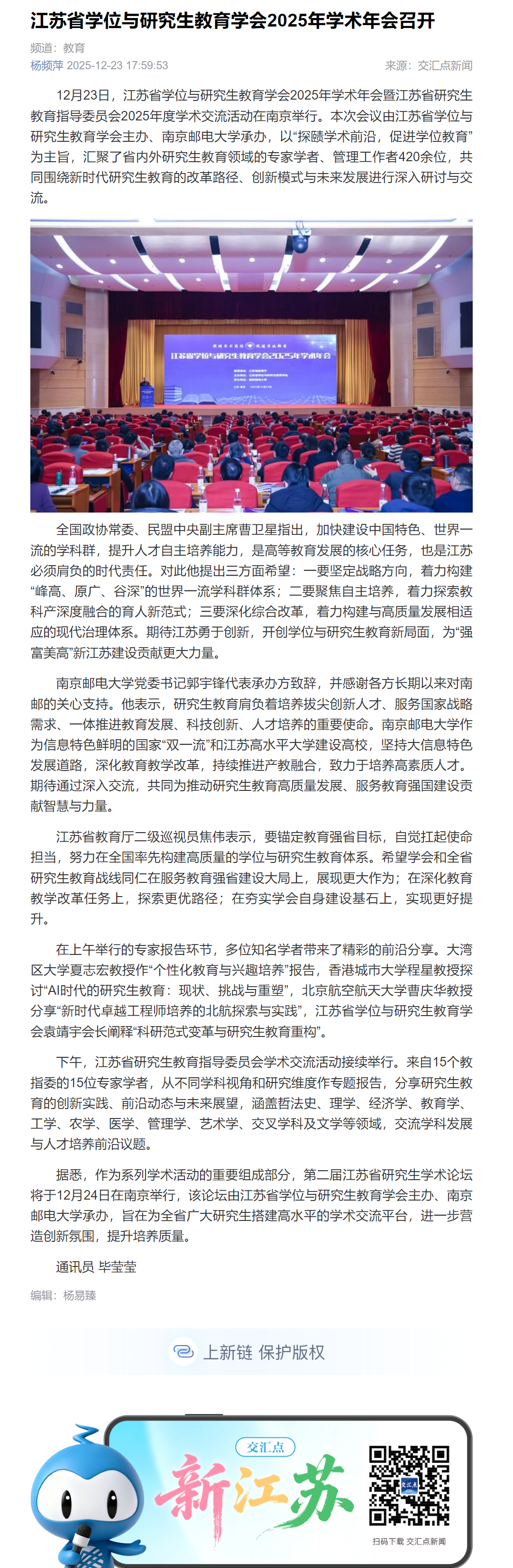 【新华日报客户端】江苏省学位与研究生教育学会2025年学术年会召开