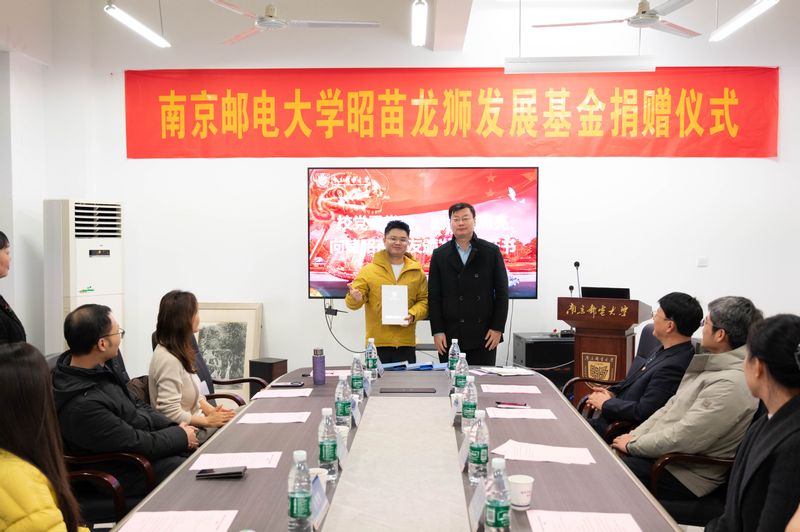 1月4日下午,南京邮电大学在仙林校区文科楼举行“昭苗龙狮发展基金”捐赠签约仪式。华知集团总裁、2009级校友储昭苗向南邮捐赠50万元设立基金,专项用于支持学校中华龙狮舞的建设和发展。校党委常委、副校长周亮出席仪式并致辞。