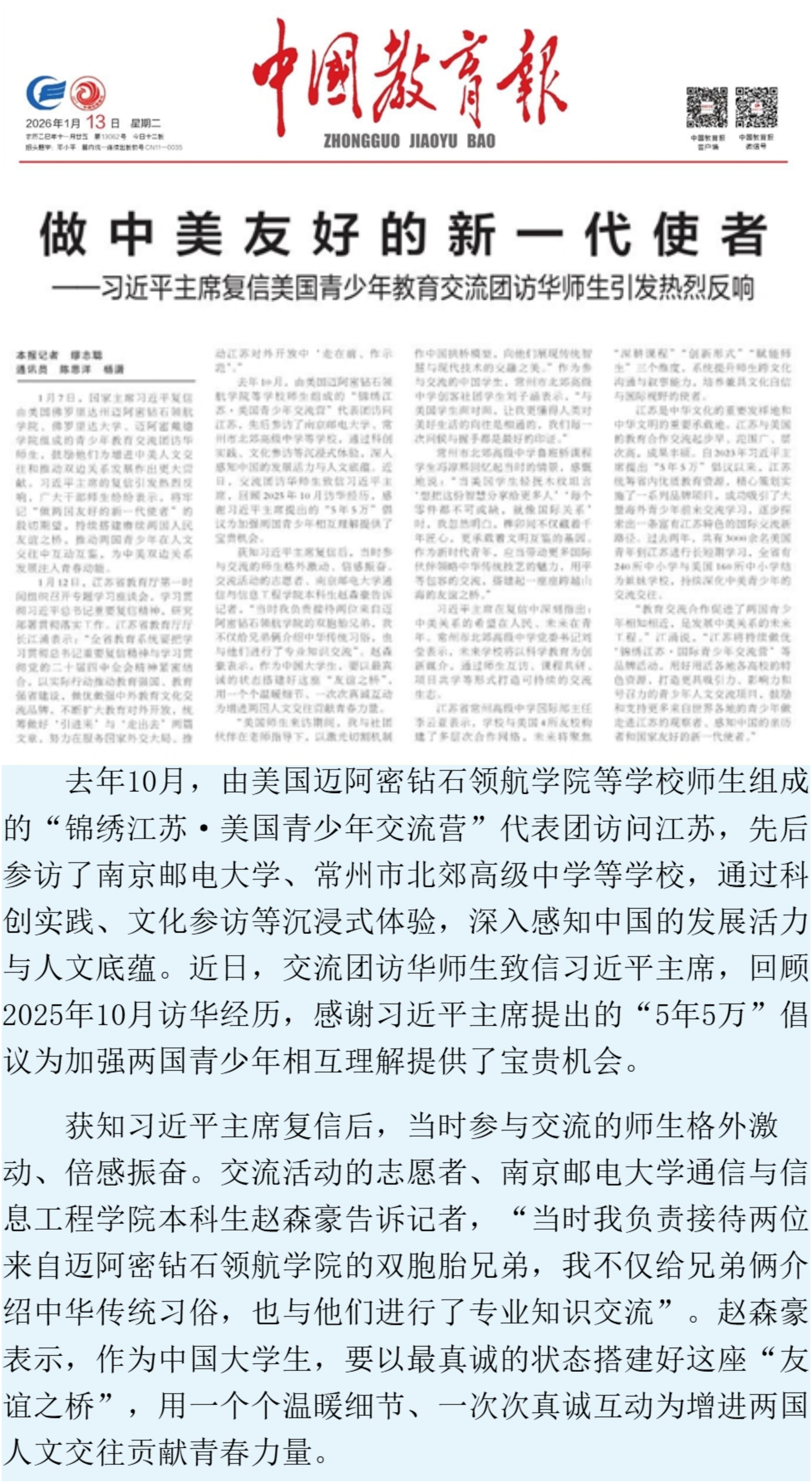 【中国教育报头版】习近平主席复信美国青少年教育交流团访华师生引发热烈反响