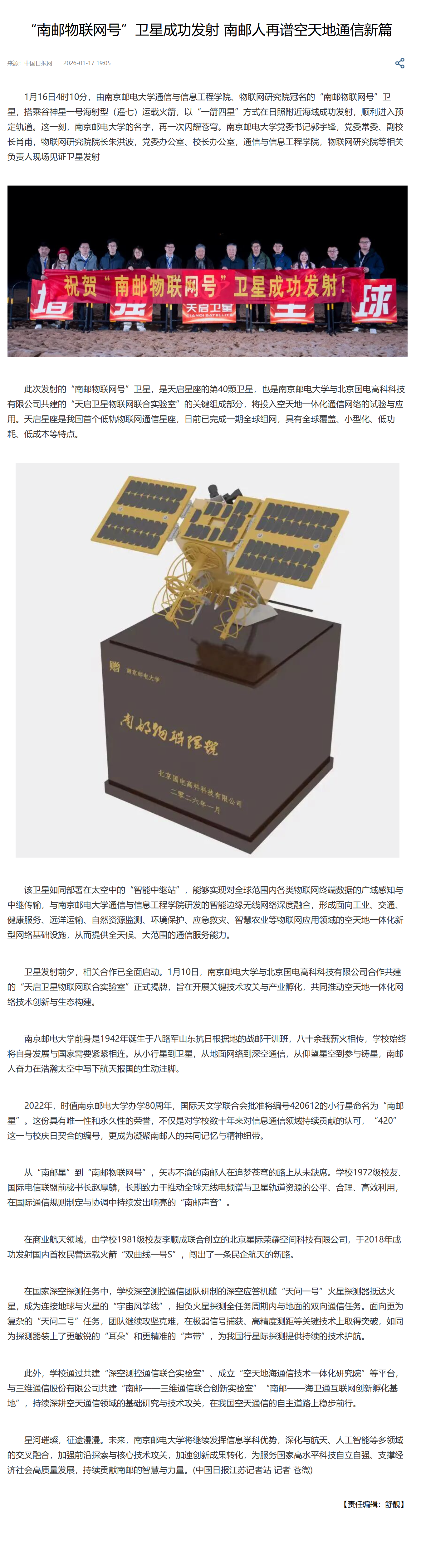 【中国日报网】“南邮物联网号”卫星成功发射 南邮人再谱空天地通信新篇
