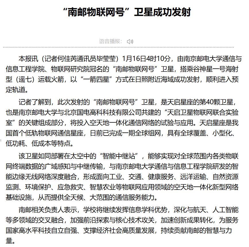 【江苏科技报】“南邮物联网号”卫星成功发射