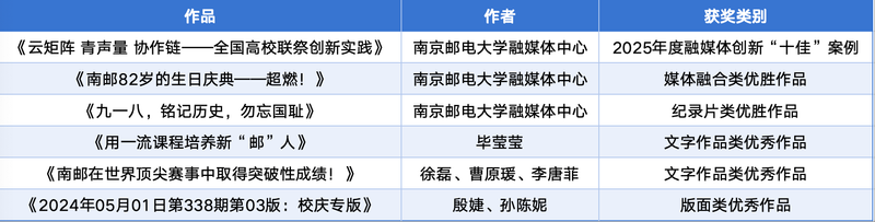 近日,江苏省高校融媒体研究会2025年年会在南京举行。大会对入选“江苏省好新闻奖”的高校优秀作品进行了表彰,并举行了江苏高校年度好新闻作品及融媒体创新案例推介交流与展示。南邮获1项融媒体创新“十佳”案例、5项好新闻作品类奖项。其中,《云矩阵 青声量 协作链——全国高校联祭创新实践》入选2025年度融媒体创新“十佳”案例,《南邮82岁的生日庆典——超燃!》获媒体融合类优胜作品,《九一八,铭记历史,勿忘国耻》获纪录片类优胜作品,《用一流课程培养新“邮”人》《南邮在世界顶尖赛事中取得突破性成绩!》获文字作品类优秀作品,《2024年05月01日第338期第03版:校庆专版》获版面类优秀作品。