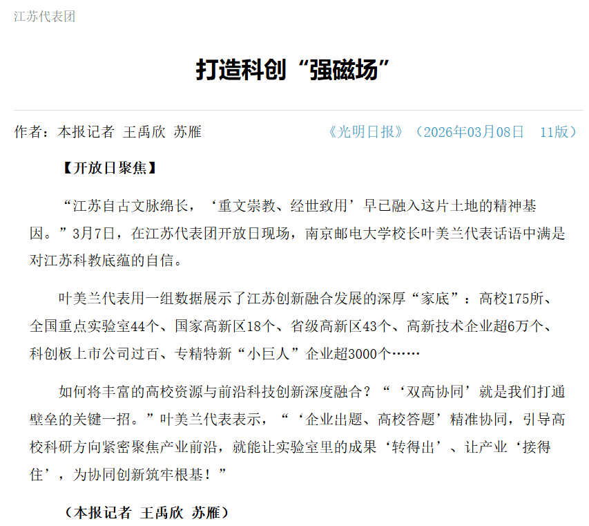 【光明日报】全国人大代表、南京邮电大学校长叶美兰:打造科创“强磁场”