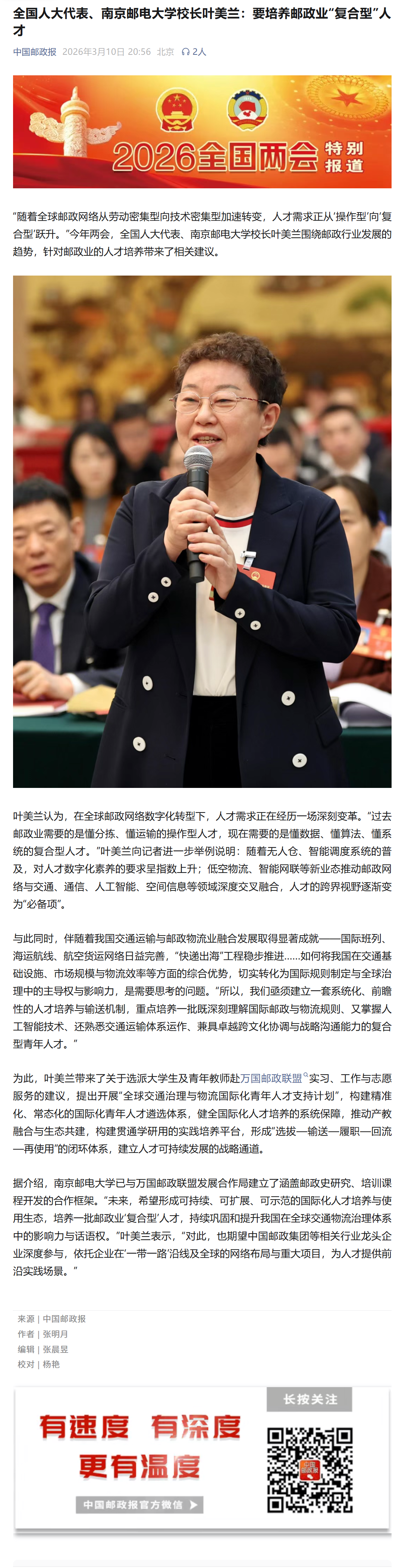 【中国邮政报】全国人大代表、南京邮电大学校长叶美兰:要培养邮政业“复合型”人才