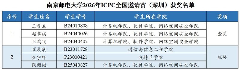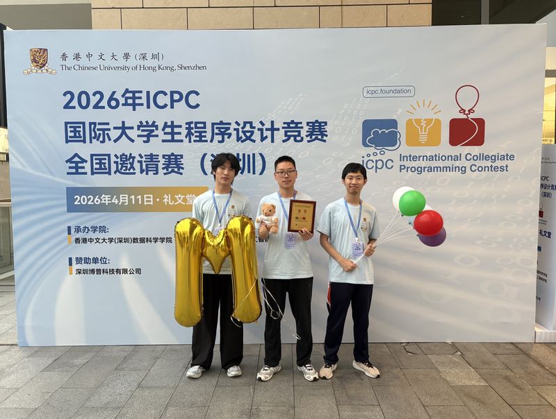 4月11日,2026年ICPC国际大学生程序设计竞赛全国邀请赛(深圳)在香港中文大学落下帷幕,南京邮电大学2024级本科生王普立、赵聿祺和卫鸿飞组成的代表队获金奖、最快解题奖(M题),2023级本科生崔晨曦、金宇轩和2025级本科生陶顾韬组成的代表队获银奖。