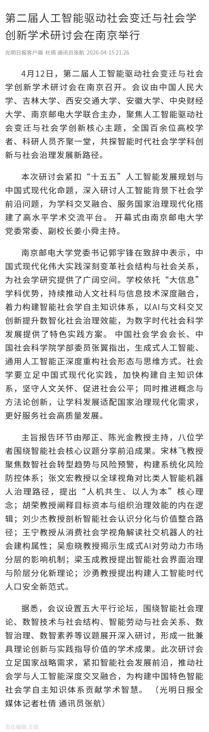 【光明日报客户端】第二届人工智能驱动社会变迁与社会学创新学术研讨会在南京举行