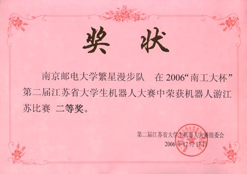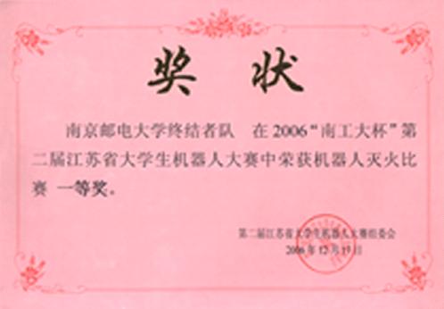 以自动化学院学生为主要参赛力量的我校机器人参赛队,在自动化学院老师的精心指导下,克服了准备时间短、训练场地紧张等困难,全身心投入,努力拼搏,在“2006‘南工大杯’第二届江苏省机器人大赛”中再传捷报,荣获了“机器人灭火组”一等奖一项,“机器人游江苏组”二等奖一项,展现了南邮学子较高的科技创新能力,为学校争得了荣誉。