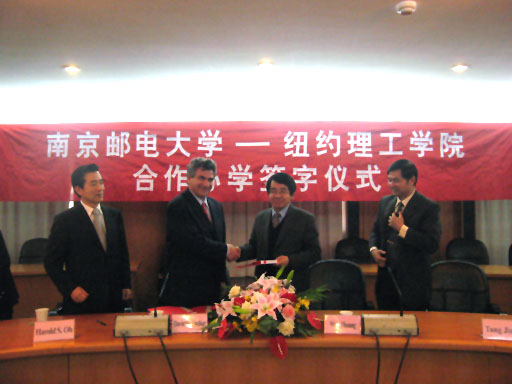 新学期伊始,我校对外合作办学取得新进展。3月2日下午,我校与美国纽约理工学院签署了合作办学谅解备忘录,这标志着双方的合作将进入一个新阶段。参加签字仪式的有美国纽约理工学院副校长David.decker、发展部主任Dr. Harold S. Oh、北美理工大学AVAYA高级研究员、项目负责人、美国计算机学会院士李涓博士,我校党委副书记、副校长唐金土,副校长黄维及相关部门负责人出席了签字仪式。