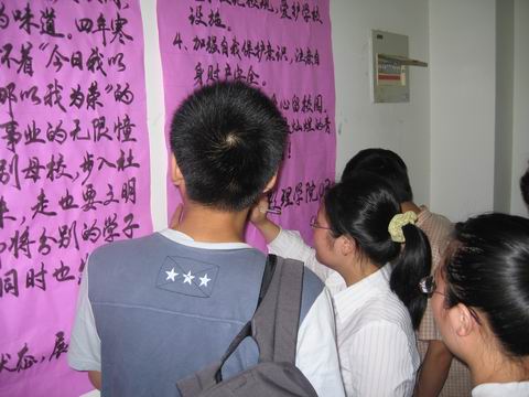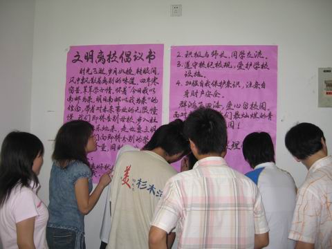本次年级聚会的主题是“以文明的方式离校”。与会老师和同学就文明离校问题进行了讨论。毕业生们纷纷表示要以文明的方式表达对同学和老师的不舍,对学校的留恋,以自己的实际行为做到文明离校,以体现当代大学生的风采。07届的毕业生拿出了早已准备好的用红色宣传纸拟写的大幅《毕业生文明离校倡议书》,并在上面郑重地签上了自己的名字。最后一次年级聚会在文明离校的倡议中圆满结束。