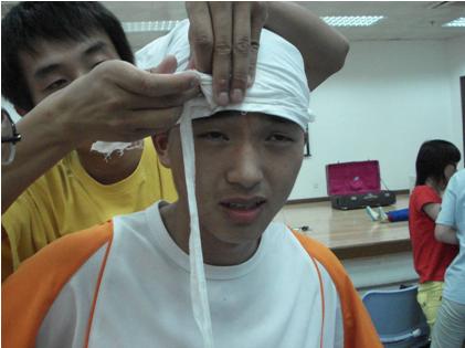 南中医的同学先就人比较容易受伤的部位作了详细的讲解,然后介绍了人体各部位受伤时的包扎方法。同学们饶有兴致地学着包扎知识,并亲自实践,在动手中学得了不少急救的方法。之后他们还列举了我们日常生活中一些不健康的习惯,让我们对提高健康水平有了更好的了解。