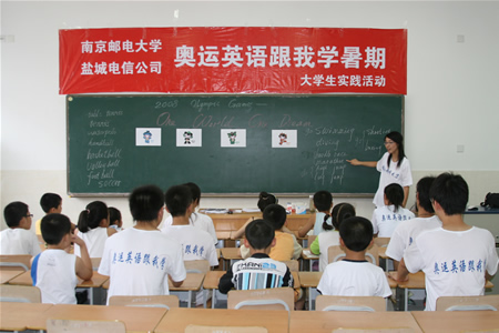 近日,南京邮电大学外语系社会实践小分队来到盐城,与盐城电信分公司合作,在市少年宫开展了主题为“奥运英语跟我学”活动。孩子们在轻松愉悦的课堂氛围中既掌握了与奥运有关的知识,又提高了学习英语的积极性。似火的骄阳挡不住志愿者们的热情,活泼的课堂上不时传来阵阵笑声。孩子们的热情和志愿者们的行动正提醒着我们:奥运的脚步离我们越来越近了。在这个携手迎奥运的良好氛围下,盐城市也适时提出了四城同创的目标。通过创建,提高城市和市民的综合素质,讲文明、树新风、迎奥运。外语系社会实践小分队的活动也引起媒体关注,盐城市电视台和盐城晚报均有相关报道,收到良好社会效益。
