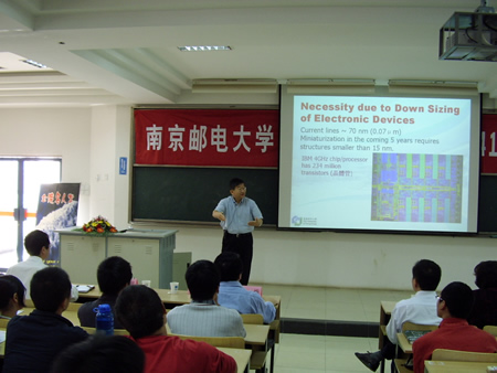 10月9日上午10:30,南邮品牌栏目“金陵名人堂”第41期在教二—301教室准时举办。本期讲座由中科院院士,著名化学家、材料学家李述汤教授为我校师生讲解“纳米科学和技术”。副校长黄维教授、党委宣传部许公权部长、研究生部蒋国平主任、科技处谌进副处长出席了本次讲座,讲座由校团委张翼书记主持。