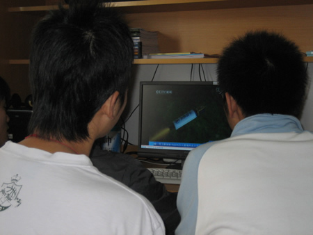 下午,同学们一下课就急急忙忙的赶回宿舍,来到电脑前等待这一紧张时刻的到来。同学们不时的拿出手机看时间,既紧张又迫不及待。最后10秒倒计时开始,宿舍楼学生们一起倒计的声音响彻校园,在学生们激动的呼声中,屏幕里运载“嫦娥一号”的长征三号甲火箭缓缓升空,钻进云层。随后,各测控点的报告此起彼伏,不少学生也从宿舍里跑到阳台,看“嫦娥”是否在南京上空留下足迹。