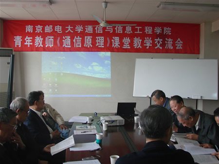 10月23日,通信与信息工程学院教学指导专家组在三牌楼校区教学主楼613室举行了青年教师<<通信原理>>课堂教学交流会,这也是继<<信号与线性系统>>课堂教学交流会后,学院第二次对面向全校开设的专业基础课组织的教学指导、交流活动.会议由党委书记车军华主持。学院教学指导专家组成员曹伟、酆广增、张力军、余兆明、胡建彰、林洪榕、邵钟浩、吴志忠、祁玉生教授,青年教师张翠芳、储婉琴、孔凡坤、卢敏、王禾、赵婧华,《通信原理》课程所在的通信工程系的系主任,该课程的负责人及担任该课程的其它相关教师参加了交流会。