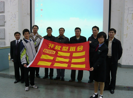 院党委副书记毛建平老师首先致辞。他指出,“开放型班会”是由计算机学院发起并面向全校的班级活动,目的是把普通的班会开放化,让更多的同学参与进来,从中受益,也让更多的普通同学从班会组织中得到锻炼。每期班会确定一个主题,由本院各班级申请承办,承办班级全面负责“开放型班会”的各项工作。班会正式开始前还进行了简单的授旗仪式,毛老师将印有“开放型班会”的旗帜授给B070309班班长徐道远、团支书孔颖,标志着“开放型班会”的正式启动,该面旗帜也将在学院各承办班级中传递。